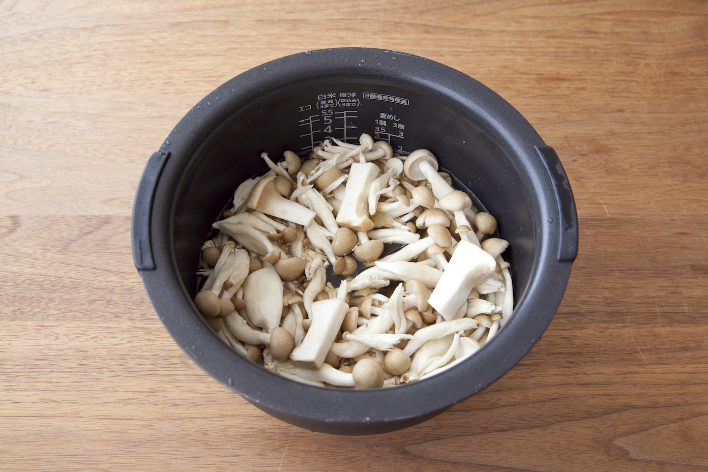 米を研いで炊飯器の内がまに入れ、しょうゆ、酒、みりんを入れてから2合の線まで水を入れ、昆布、しめじ、エリンギ、油揚げも内がまに入れ、炊飯する。