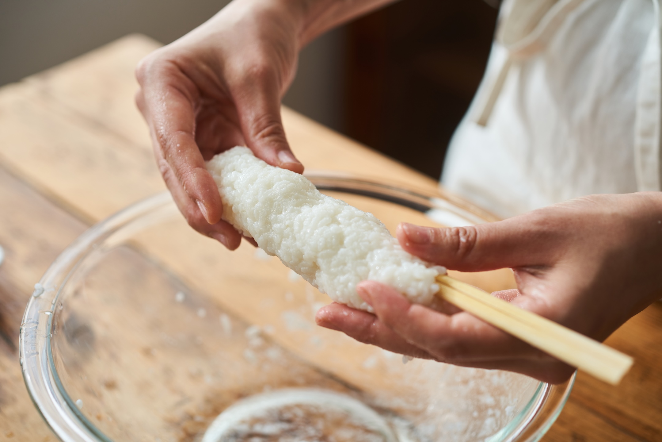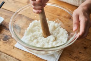 ボウルにごはんを入れて、水で濡らした麺棒などでつくようにしてたたく。