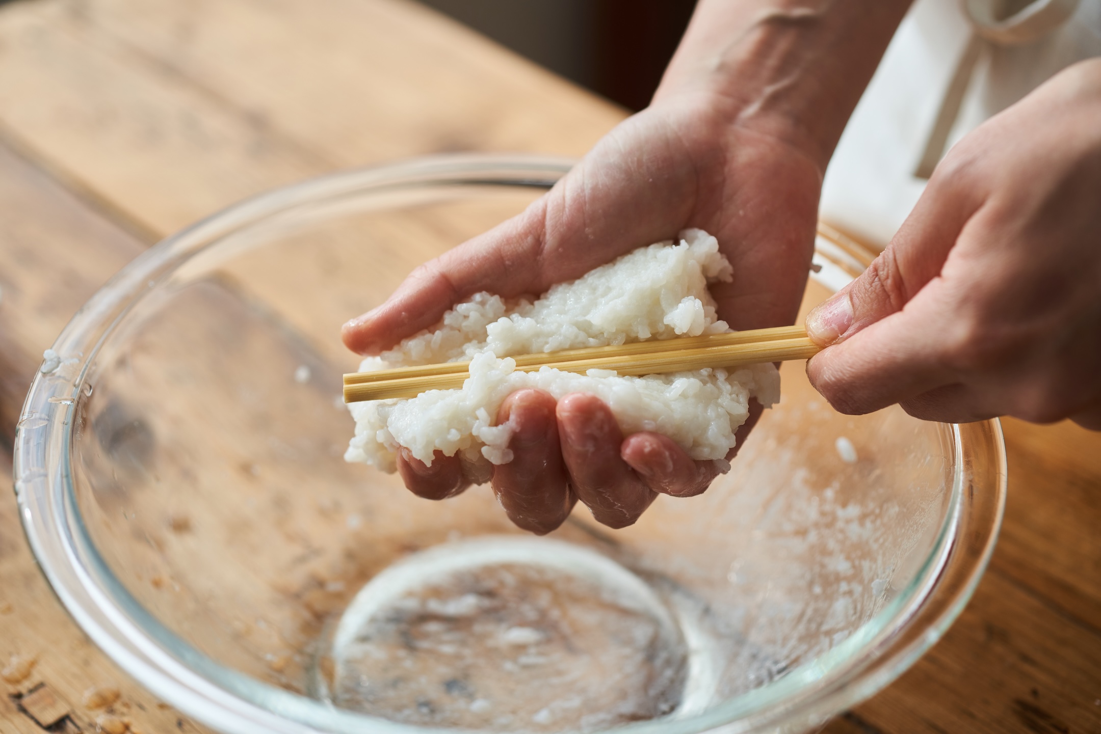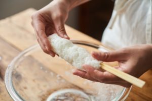 割り箸3本を水で濡らし、濡らした手でごはんをつけて、しっかり固める。塩少々(分量外)をふる。