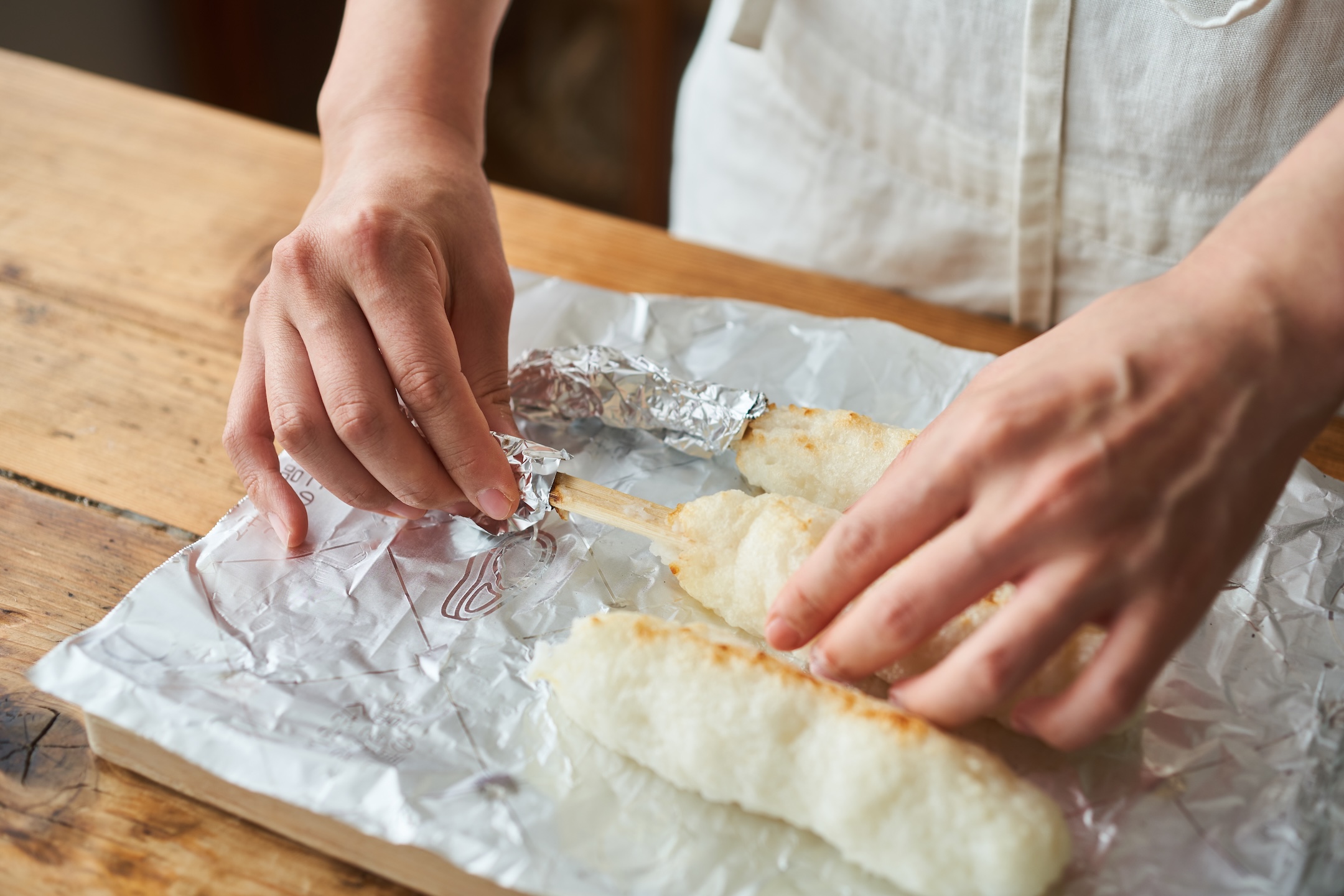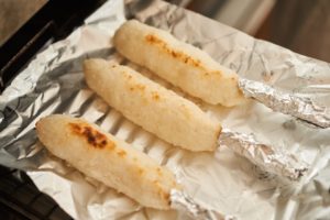 出ている割り箸をアルミホイルで包み、魚焼きグリルでこんがりと焼き色がつくまで5〜8分焼く。