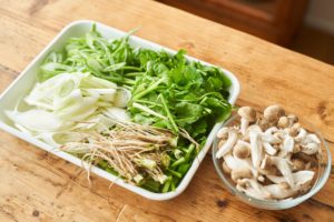 せりは根ごと3〜4cm幅、長ねぎは斜め薄切り、しめじは石づきを取り除き手でほぐす。