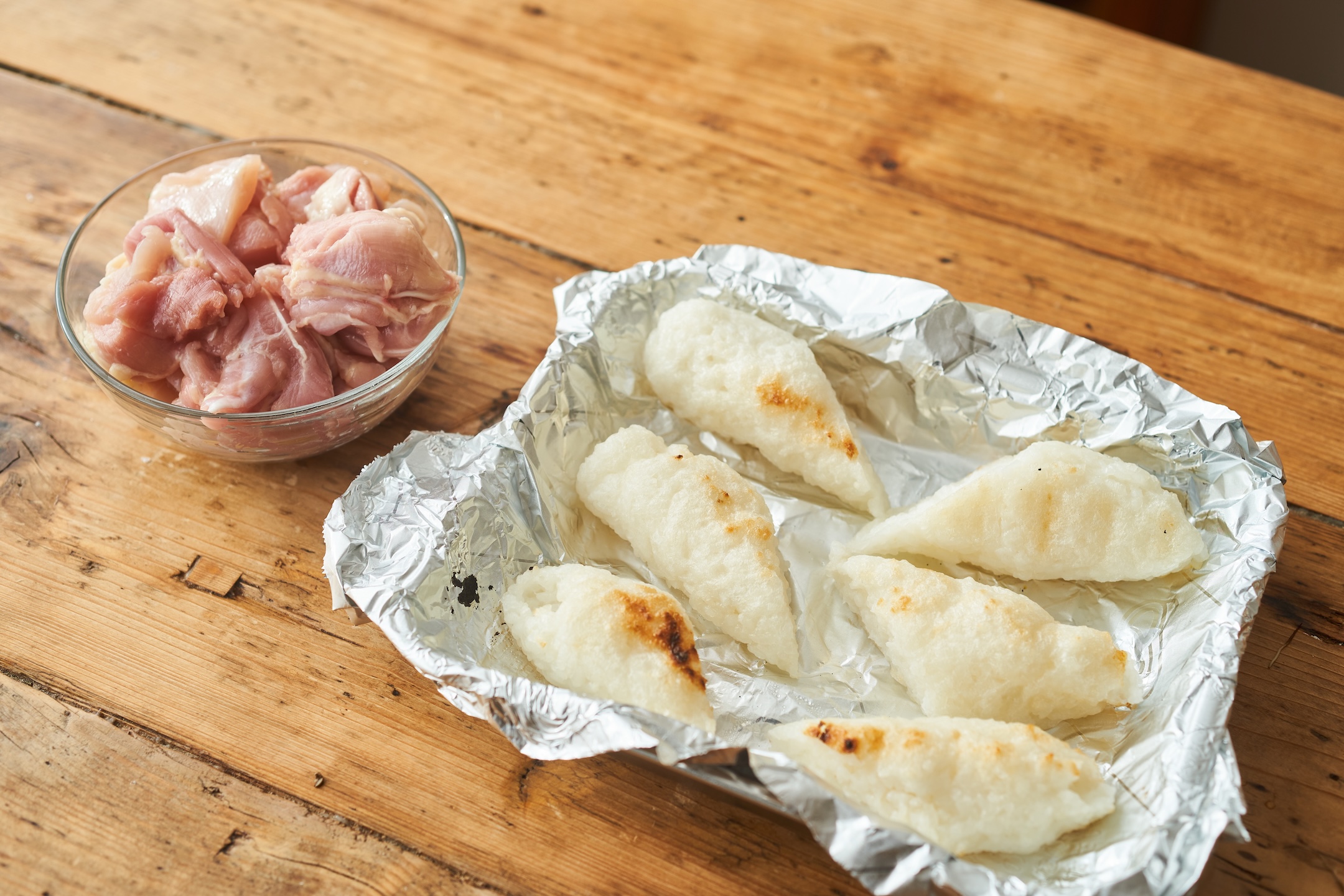 きりたんぽは斜め半分、鶏肉は一口大に切る。