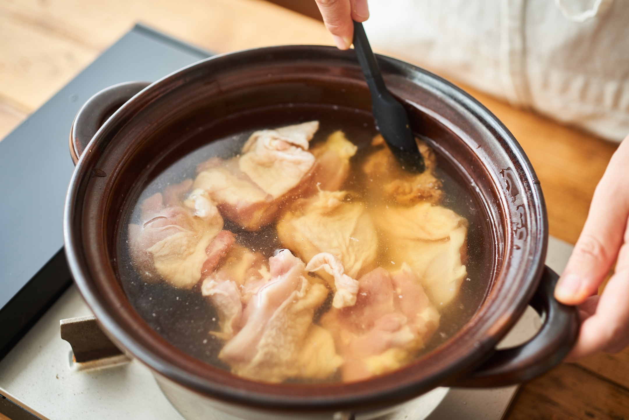 鍋にだし汁、鶏肉、みそを入れて中火にかける。
