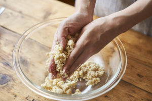 ココナッツオイルを加えて手をすりあわせるようにして混ぜ、塩麹を加えてひとまとまりにする。