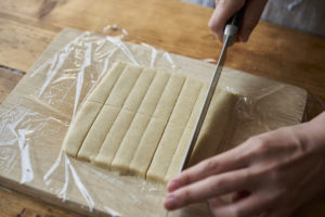 横半分に切り、それぞれ8本ずつ切り分ける。