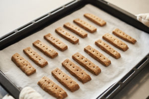 オーブンシートを敷いた天板に並べ、竹串の太いほうで穴を開け、20〜25分焼く。