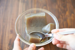こんにゃくはスプーンで一口大にちぎり、熱湯で2分ほど茹で、ざるにあげ、しっかり水気をきる。