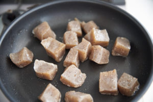 フライパンにごま油を中火で熱し、こんにゃくを入れる。