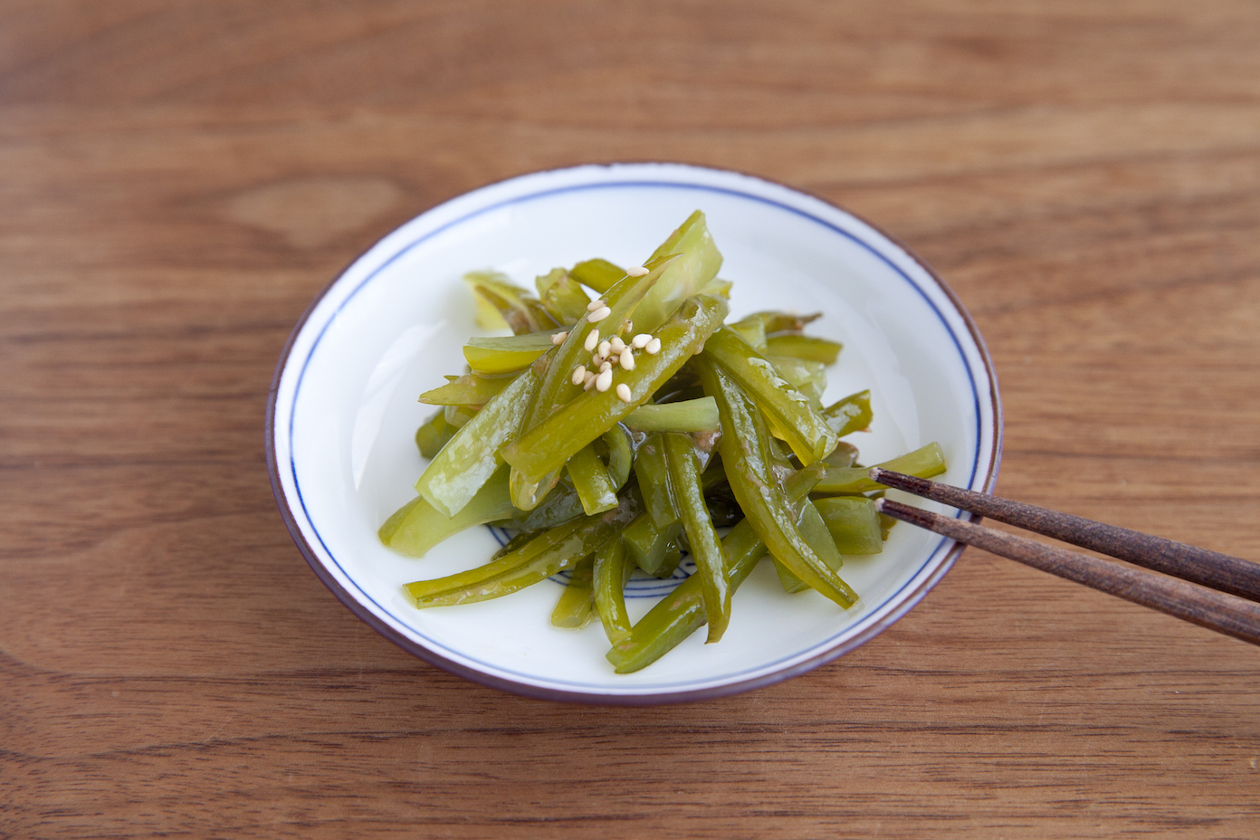 茎わかめにたたき梅、めんつゆ、ごま油を和えて器に盛り、いりごまを散らす。