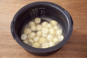 炊飯器の内釜に米、酒を入れて2合の線まで水を入れ、