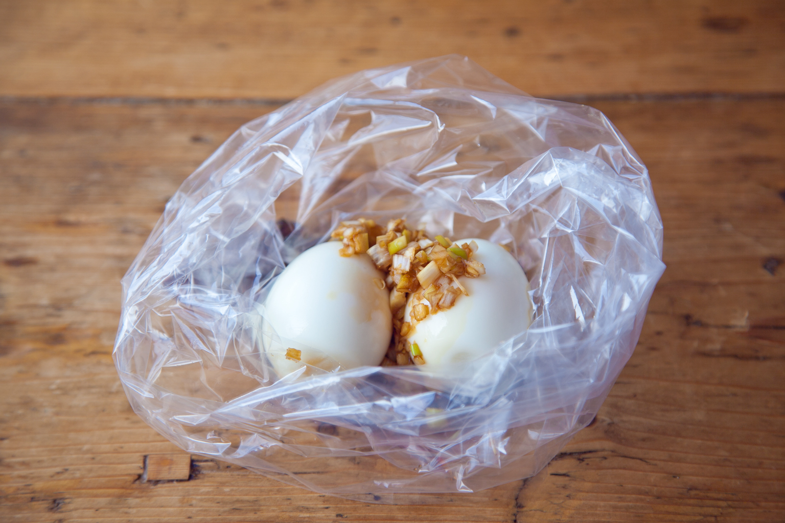 【1】ポリ袋に茹で卵、(A)をいれてなじませ、冷蔵庫で1日つける。