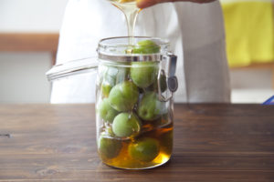 アルコール消毒などをした清潔な瓶に梅、はちみつ、黒酢を入れ冷暗所におく。