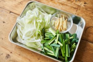 長ねぎは斜め薄切り、ニラは3cm幅、しょうがは千切りにする。