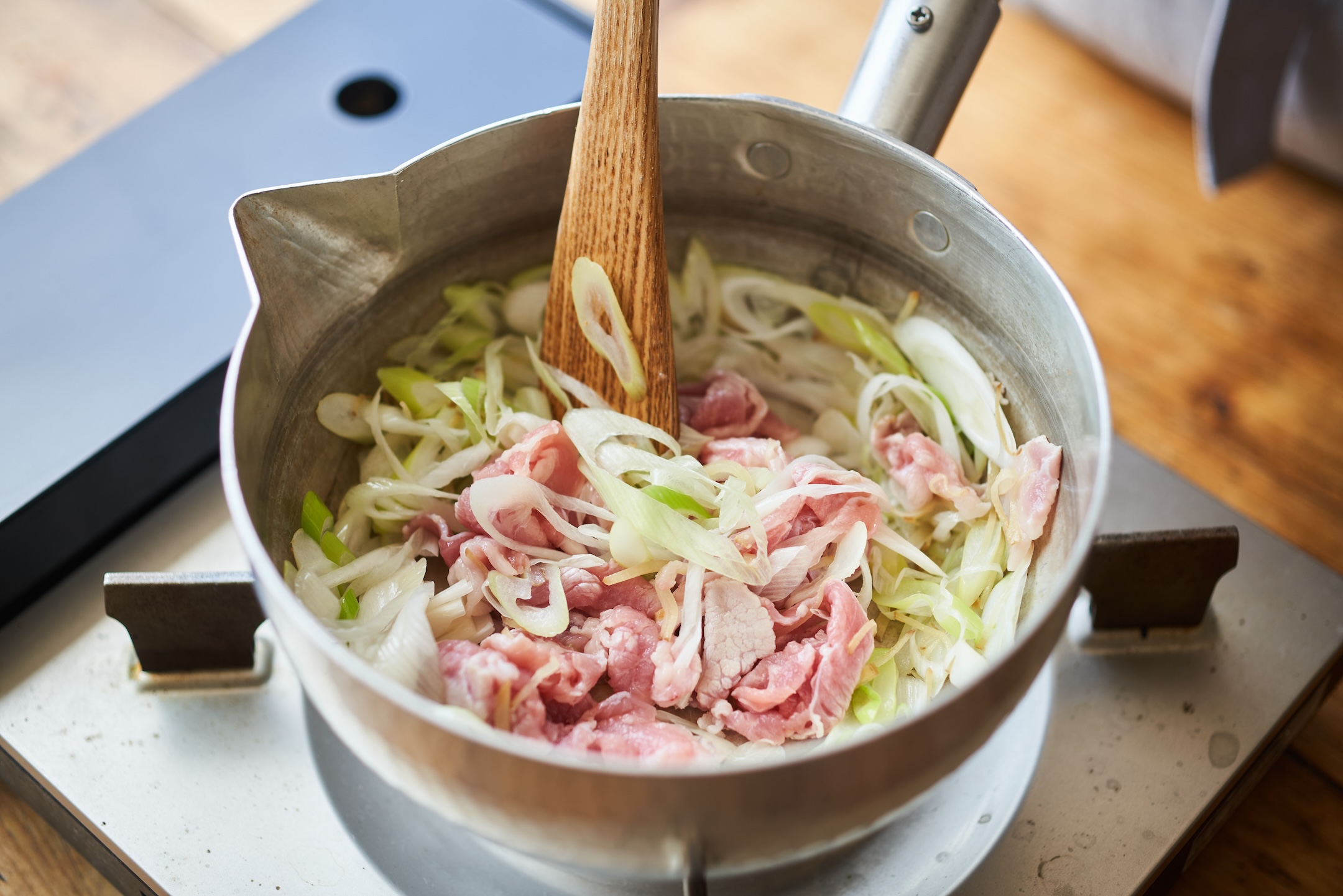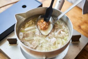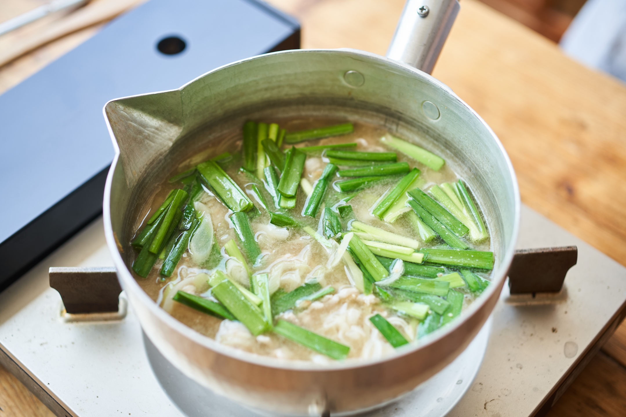 豚肉の色が変わったらだし汁を加えて、沸騰したらニラ、みそを溶き入れ、器に盛る。