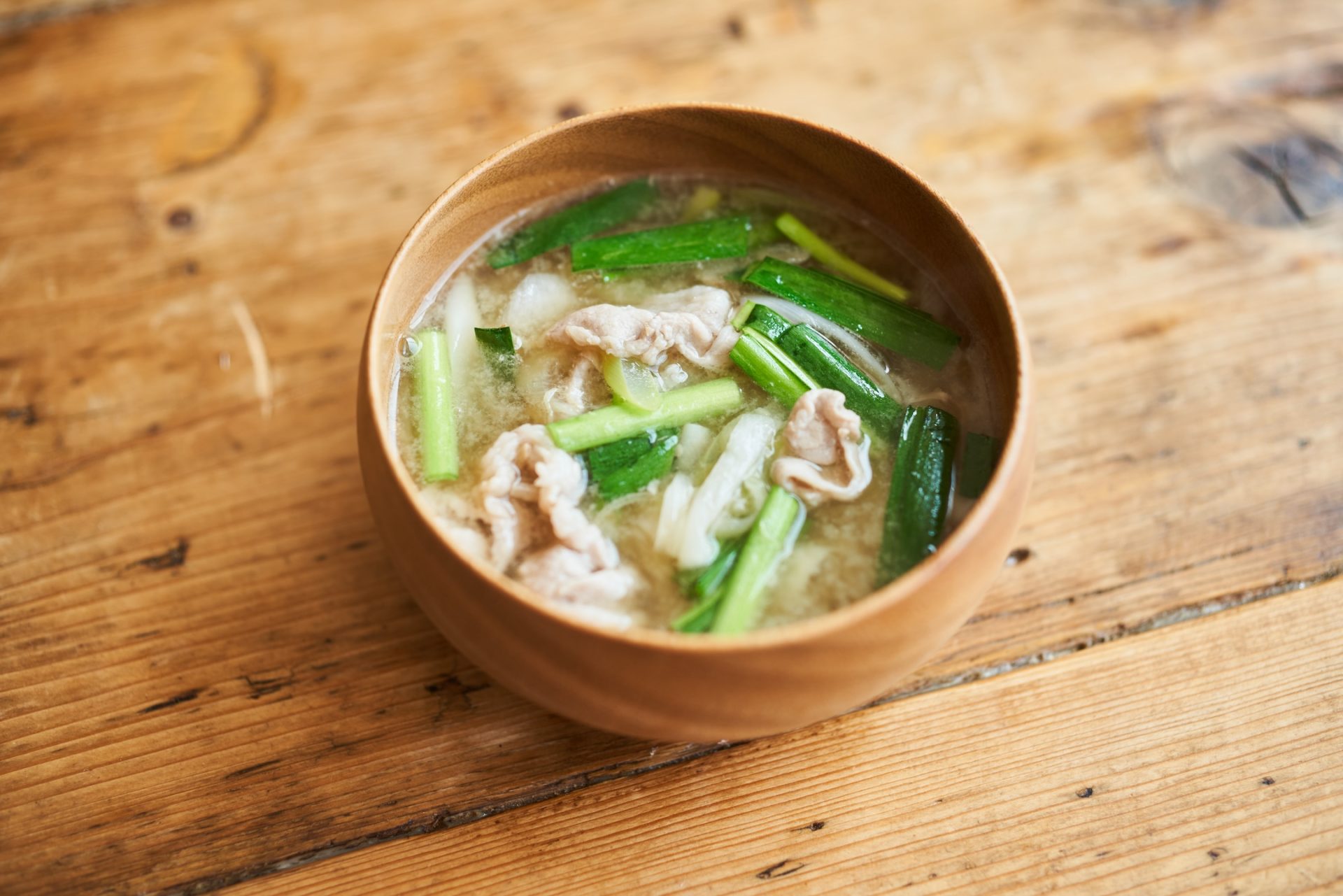 夏バテ対策にもおすすめ!豚こま肉とニラを使った「豚ニラみそ汁」のレシピです。