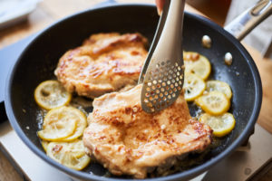 フライパンにオリーブオイルを弱めの中火で熱し、鶏肉を皮目を下にしていれる。