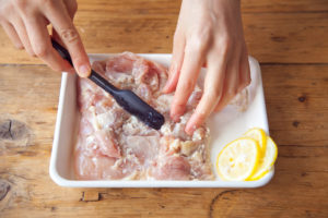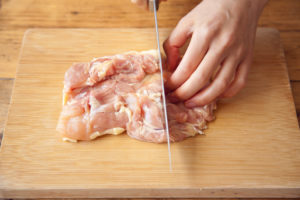 鶏肉はフォークで皮目に穴をあけ、裏面に切り込みをいれ、保存袋に入れる。