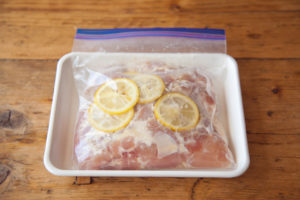 塩麹を加え揉み、レモンを加えて冷蔵庫で一晩おく。