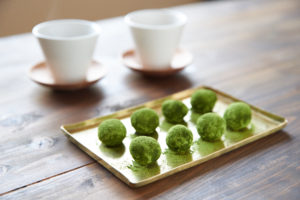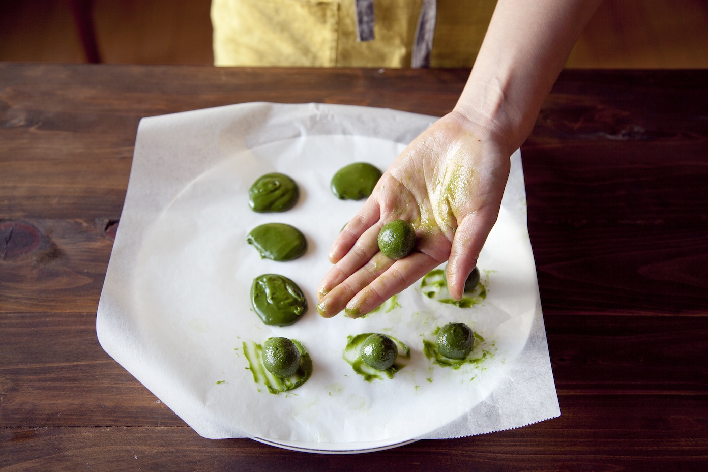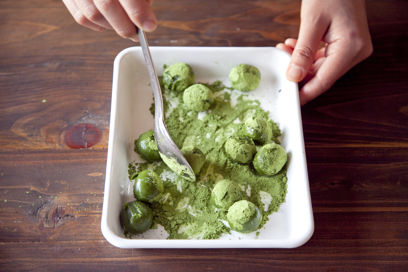 抹茶チョコレートを手早く丸め、抹茶を入れたバットで転がすようにして抹茶をまぶす。