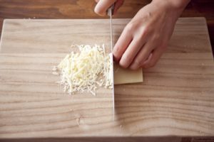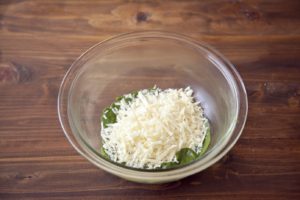ホワイトチョコレートを加えて、ふんわりラップをし、さらに電子レンジ600Wで30秒加熱し、よく混ぜてホワイトチョコレートを完全に溶かす。