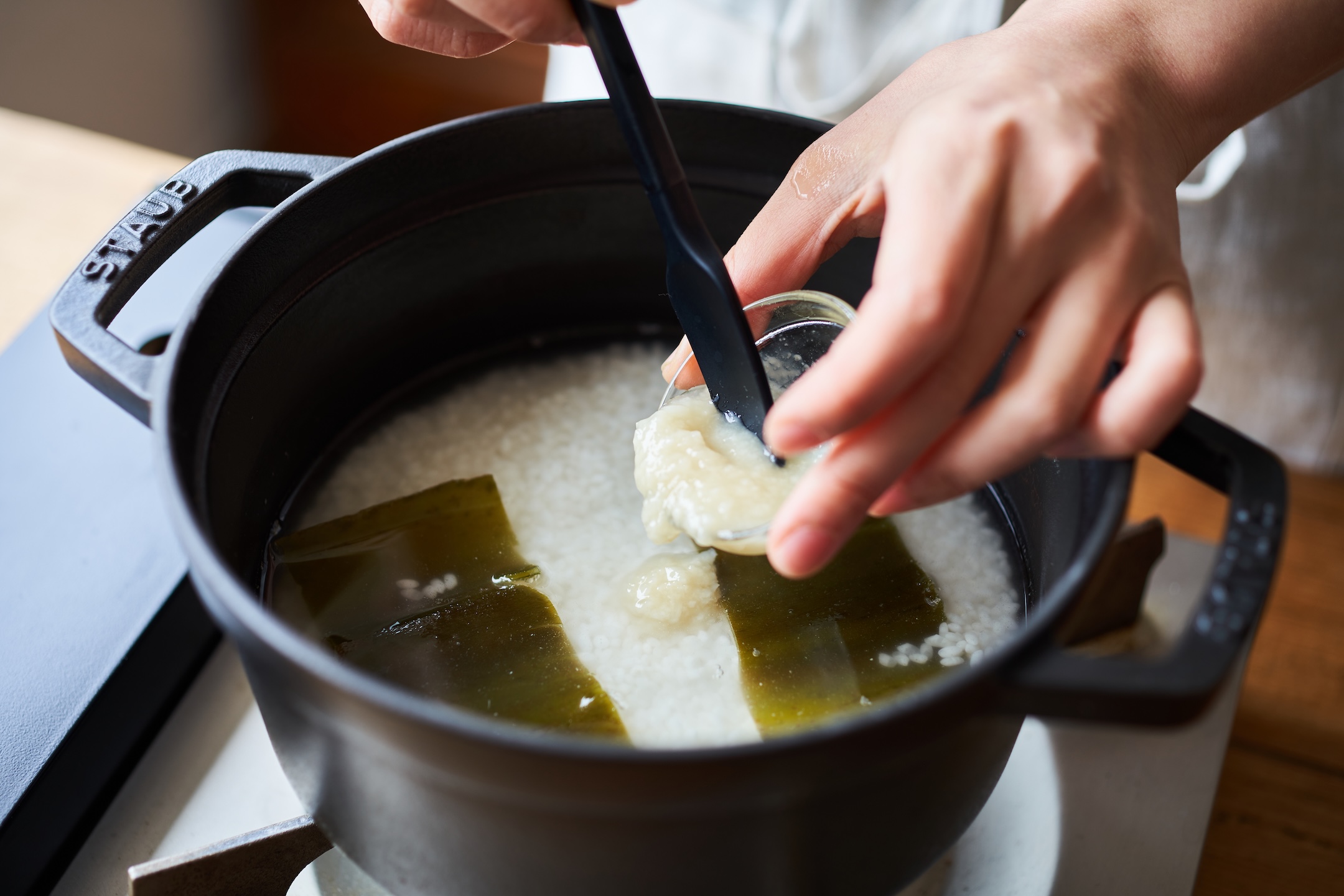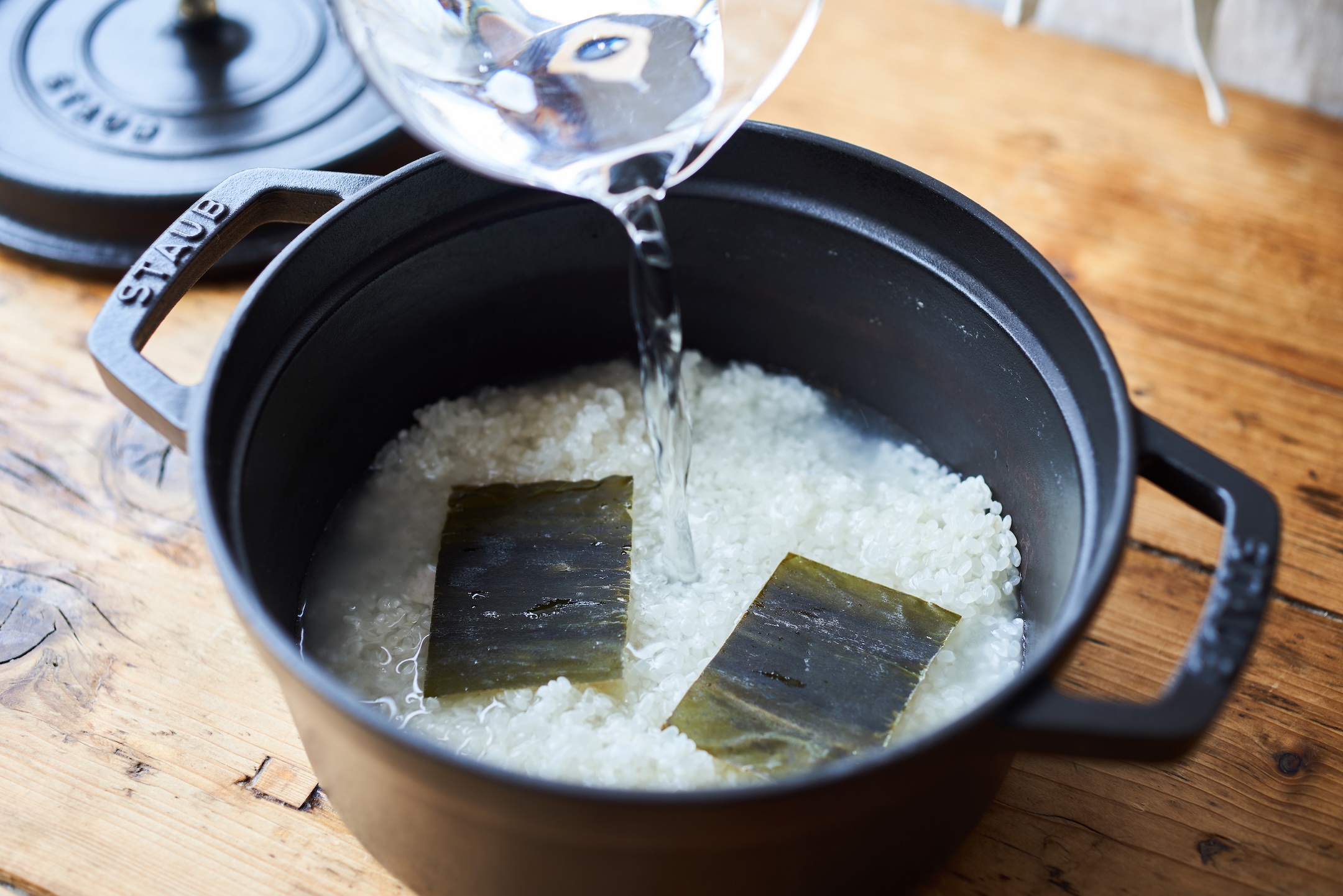 別の鍋に米、水380ml、昆布を入れ、30分おく。