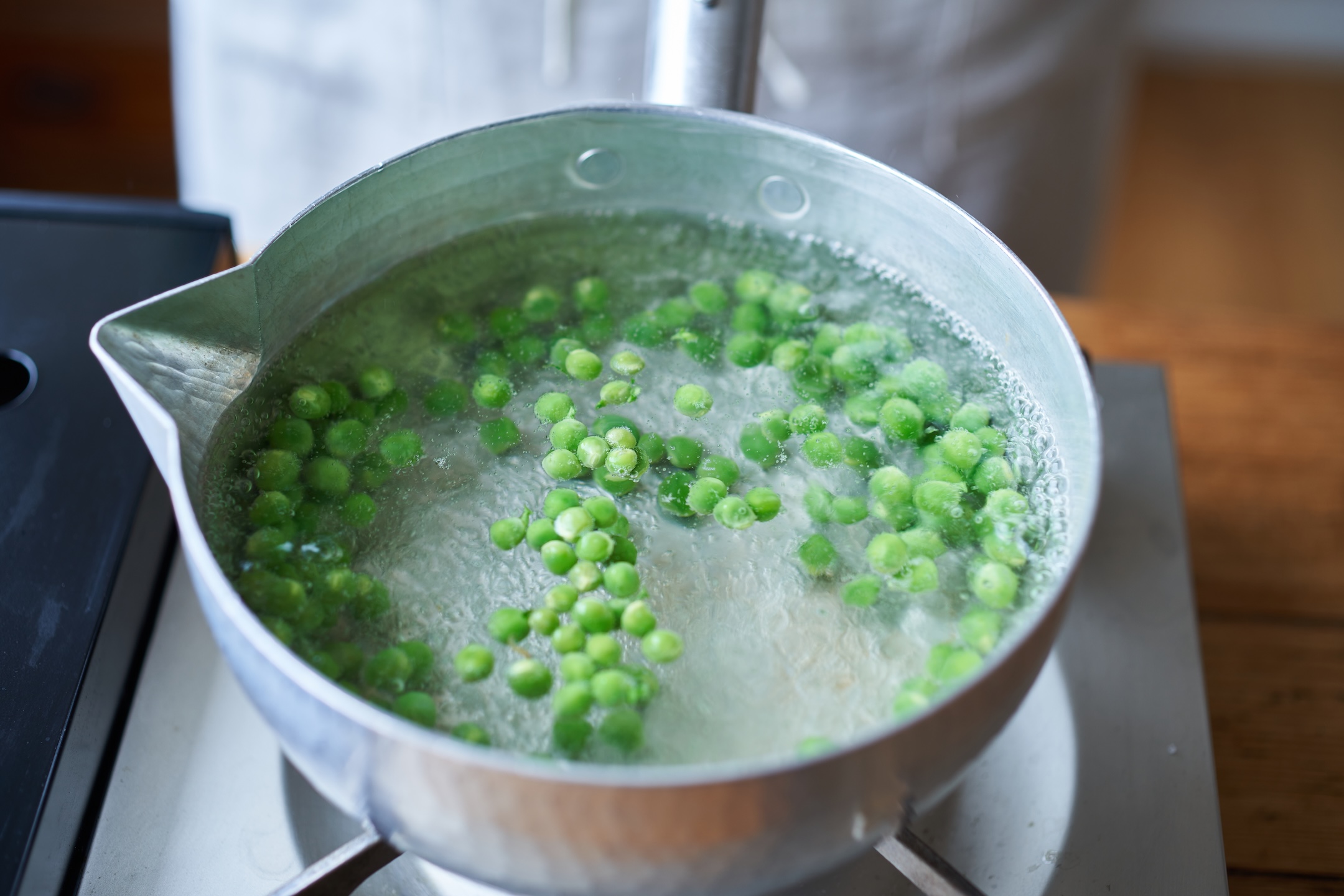 鍋に湯を沸かし、塩ひとつまみ(分量外)を加えてグリーンピースを2分ほど茹でる。