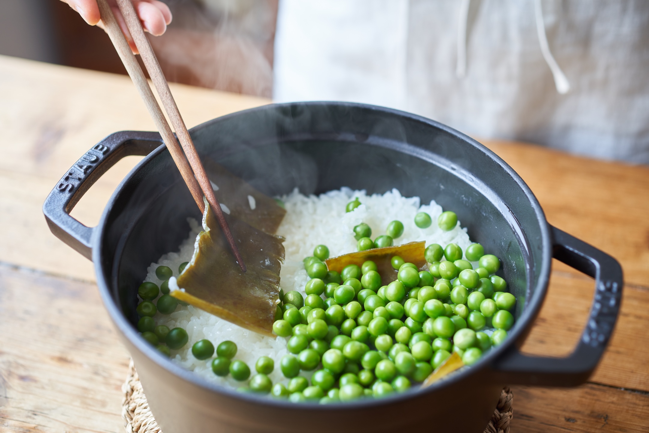 火を止めて水気を切ったグリーンピースを素早く入れて蓋を閉め、10分蒸らす。