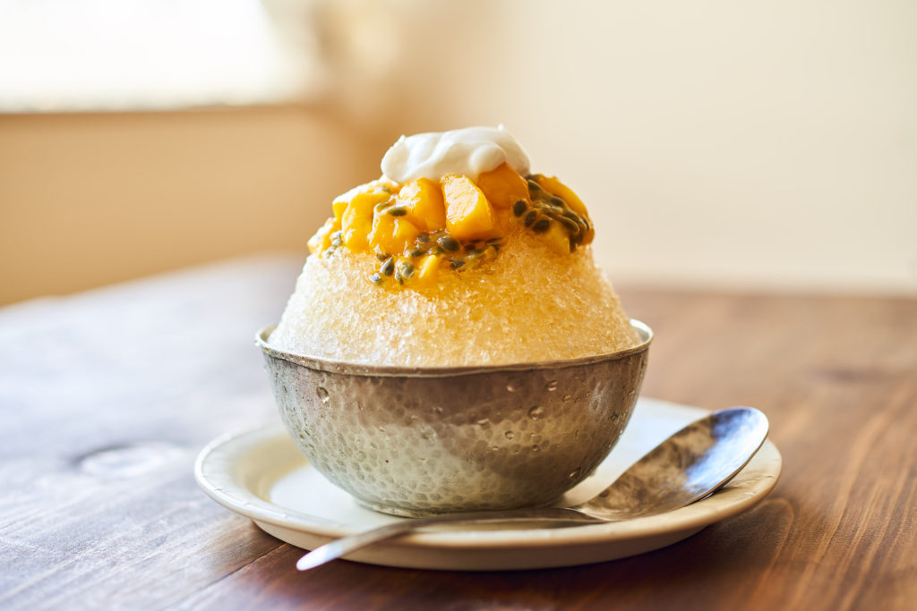 マンゴーとパッションフルーツを使った、夏らしいかき氷です。