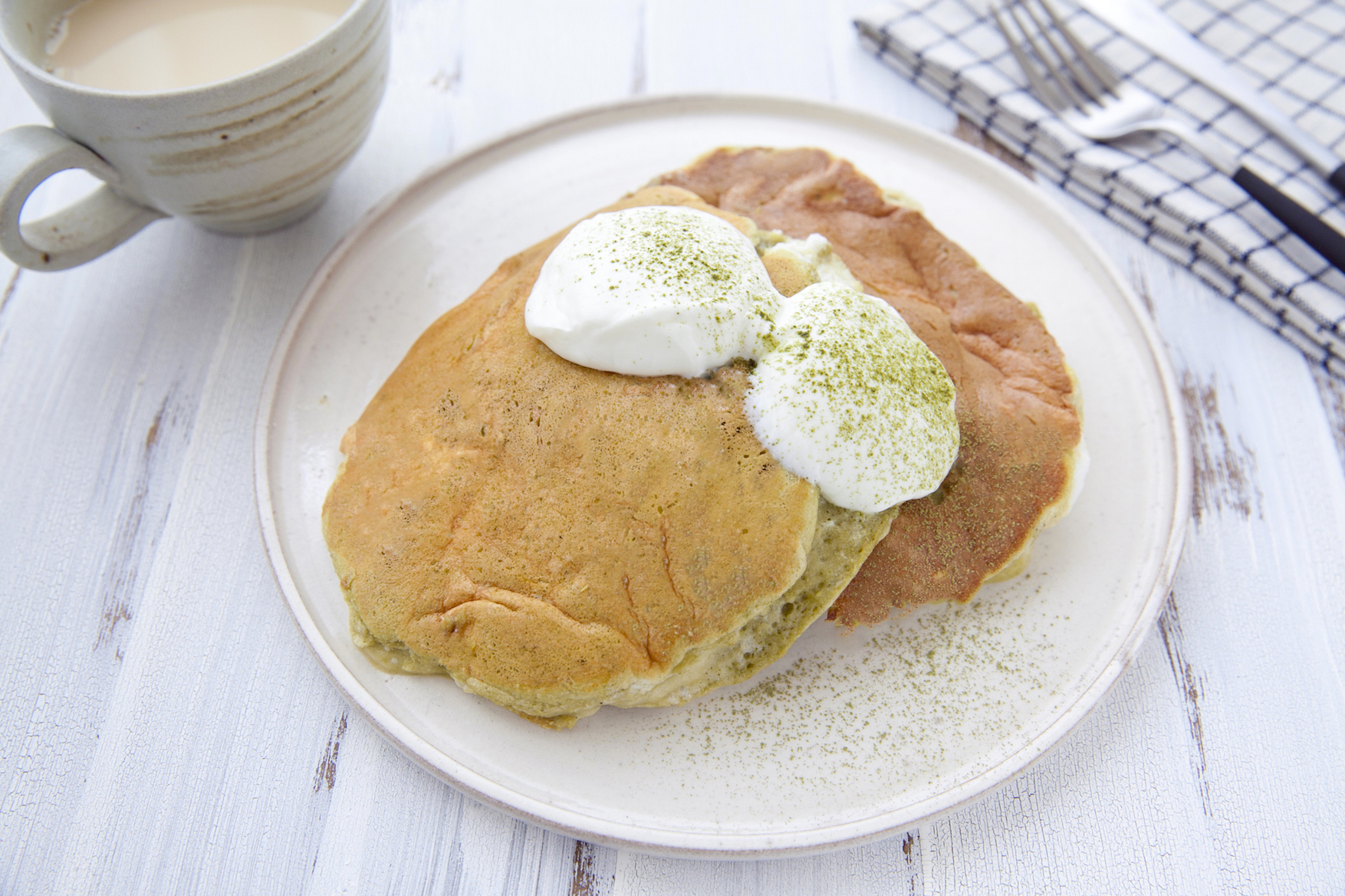 柿茶本舗さんの柿の葉のお茶「柿茶」を使ったふわふわのパンケーキです。