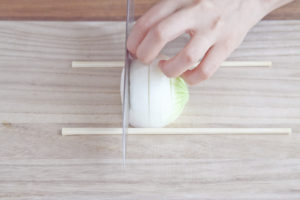 (※下まで切ってしまわないように、割りばしを置くと切りやすいです。)