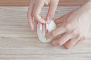【1】新玉ねぎを縦半分に切る。繊維を断ち切るように1cm程度の幅で切り込みを入れる。