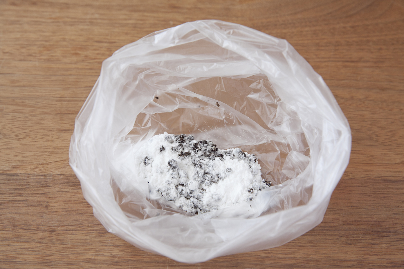 【2】生こしょう塩漬けを刻んで袋に入れ、片栗粉も加えて混ぜる。