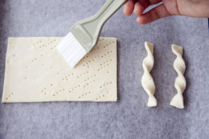 【1】パイシートは全体にフォークで穴をあけ、端から2cm幅に2枚切り取り、ねじる。