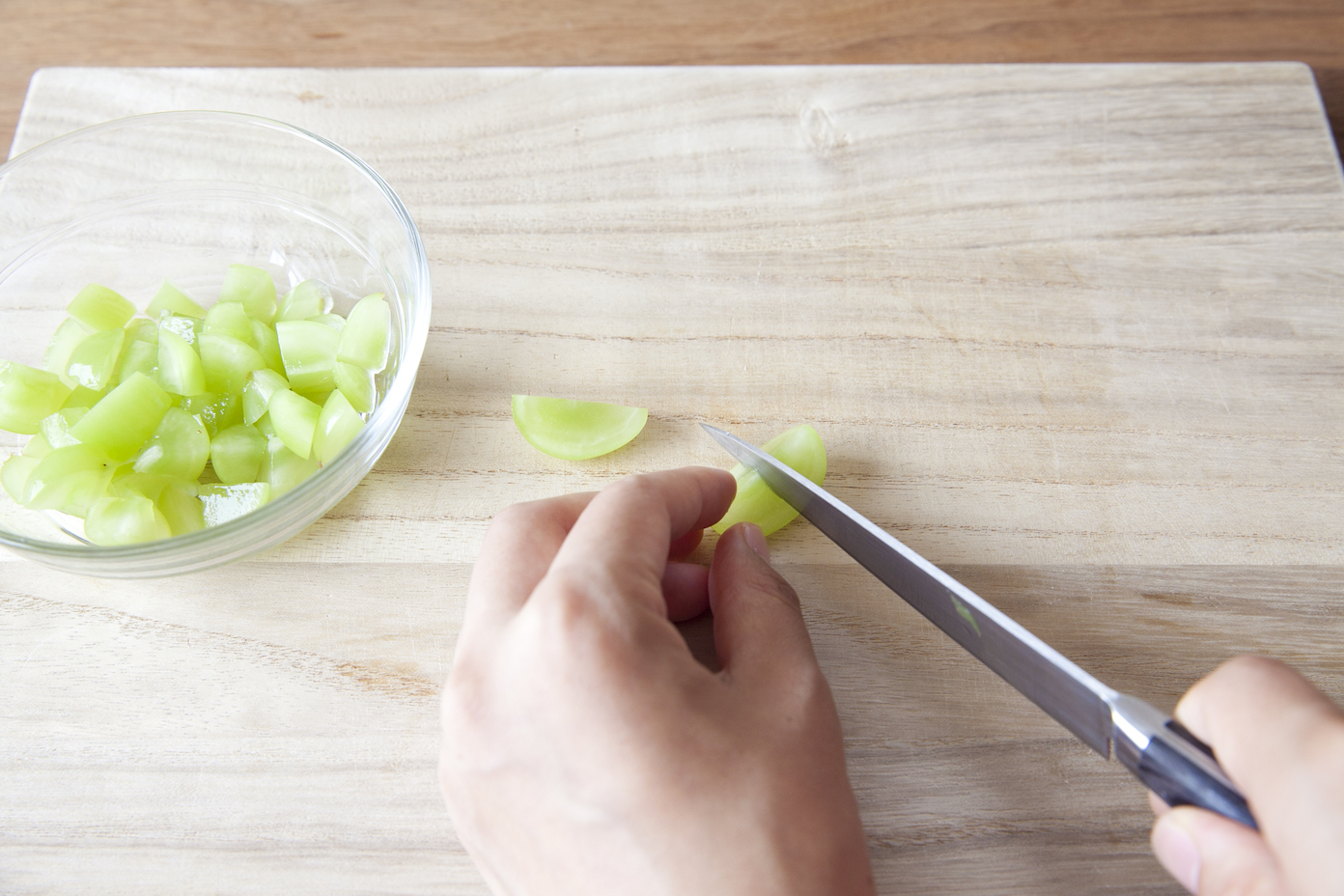 【3】シャインマスカットは6個を角切りにし、残りは半分に切る。