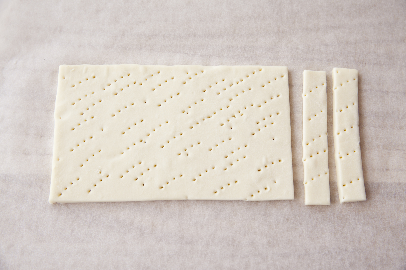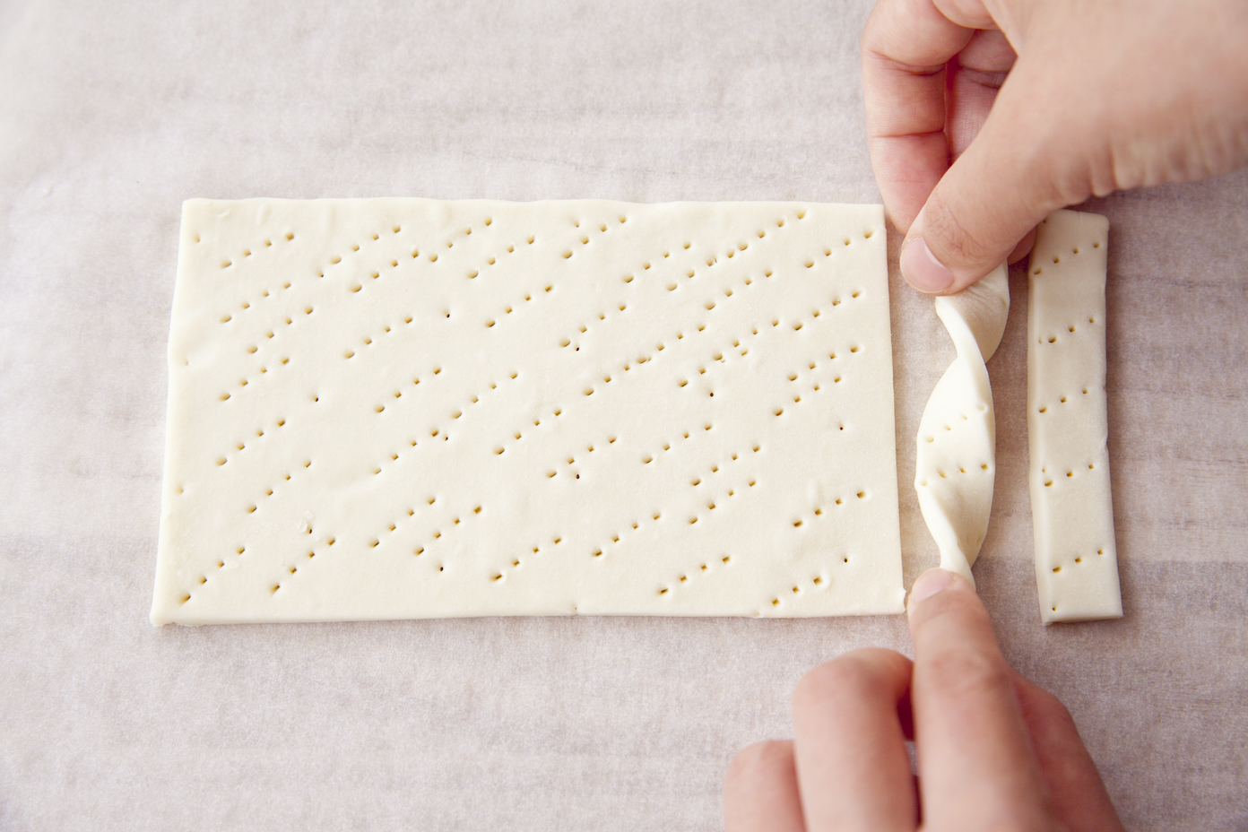 【1】パイシートは全体にフォークで穴をあけ、端から2cm幅に2枚切り取り、ねじる。