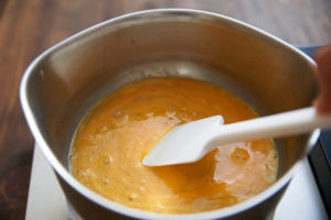 グラニュー糖、レモン果汁を加えて中火にかけ、へらでかきまぜながら加熱する。