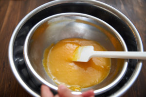 全体が混ざったら(A)を加えゴムベラで混ぜる。