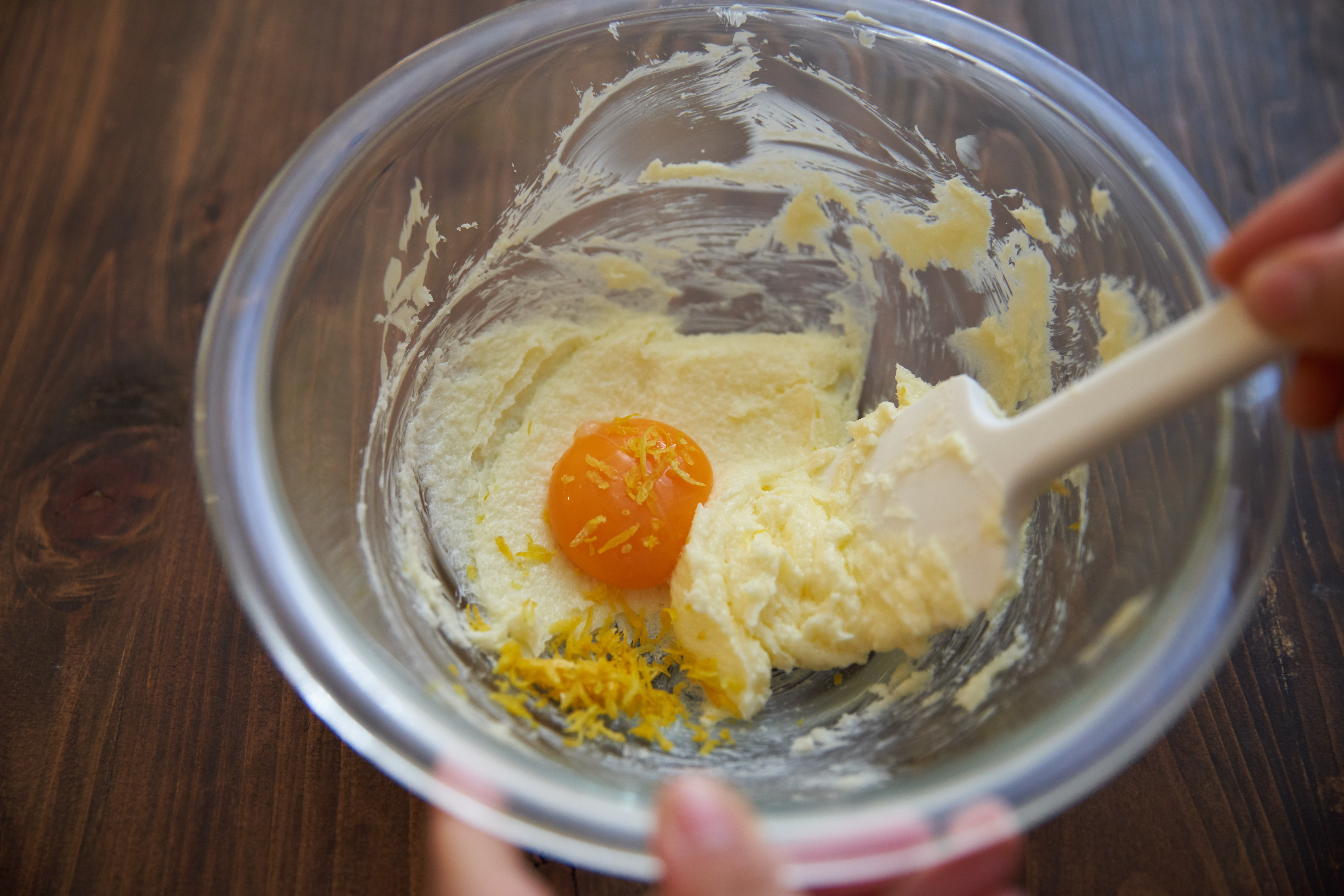 クリーム状になったらグラニュー糖を加えてすり混ぜる。