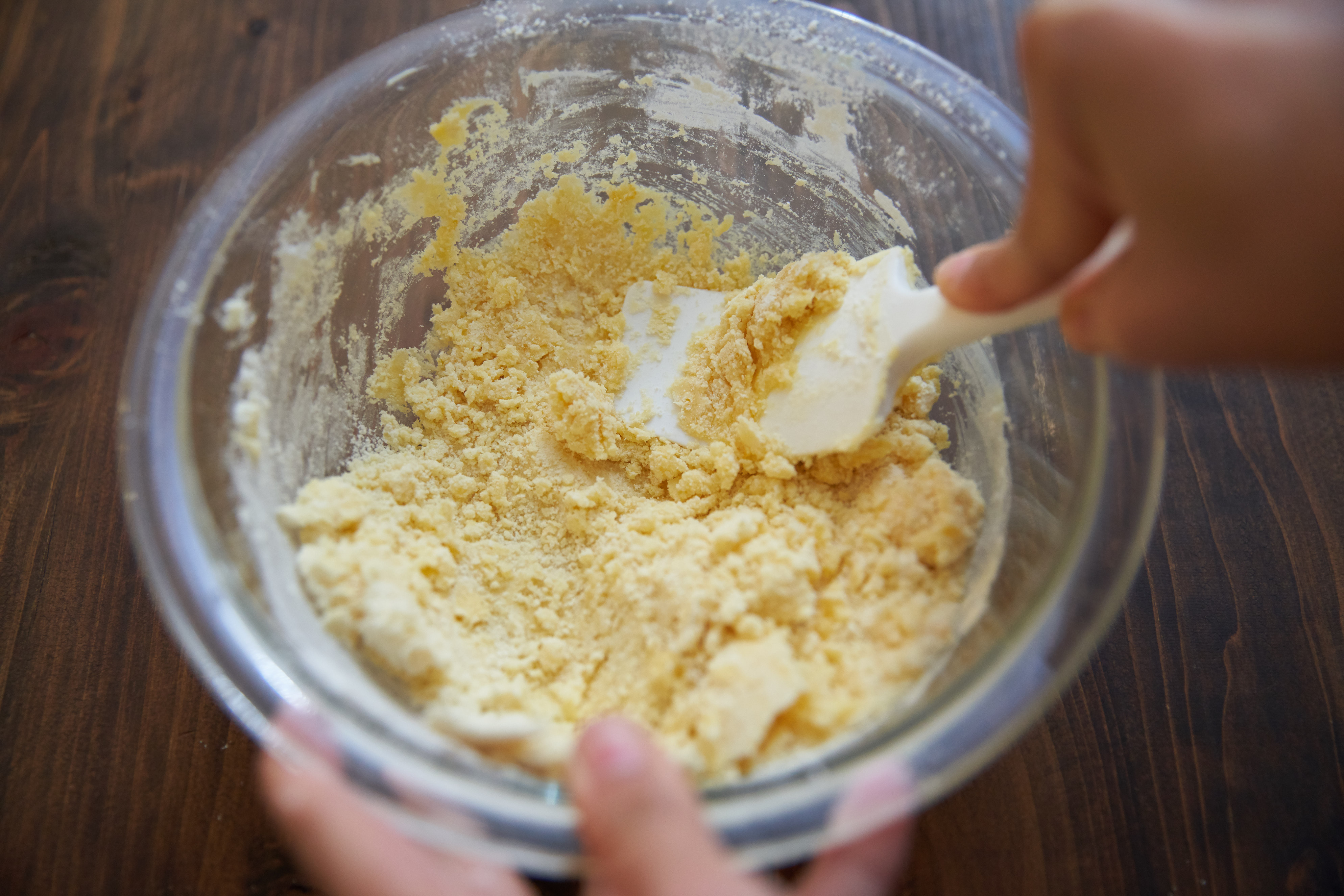 ボウルにバターをいれてゴムベラで練り混ぜ、