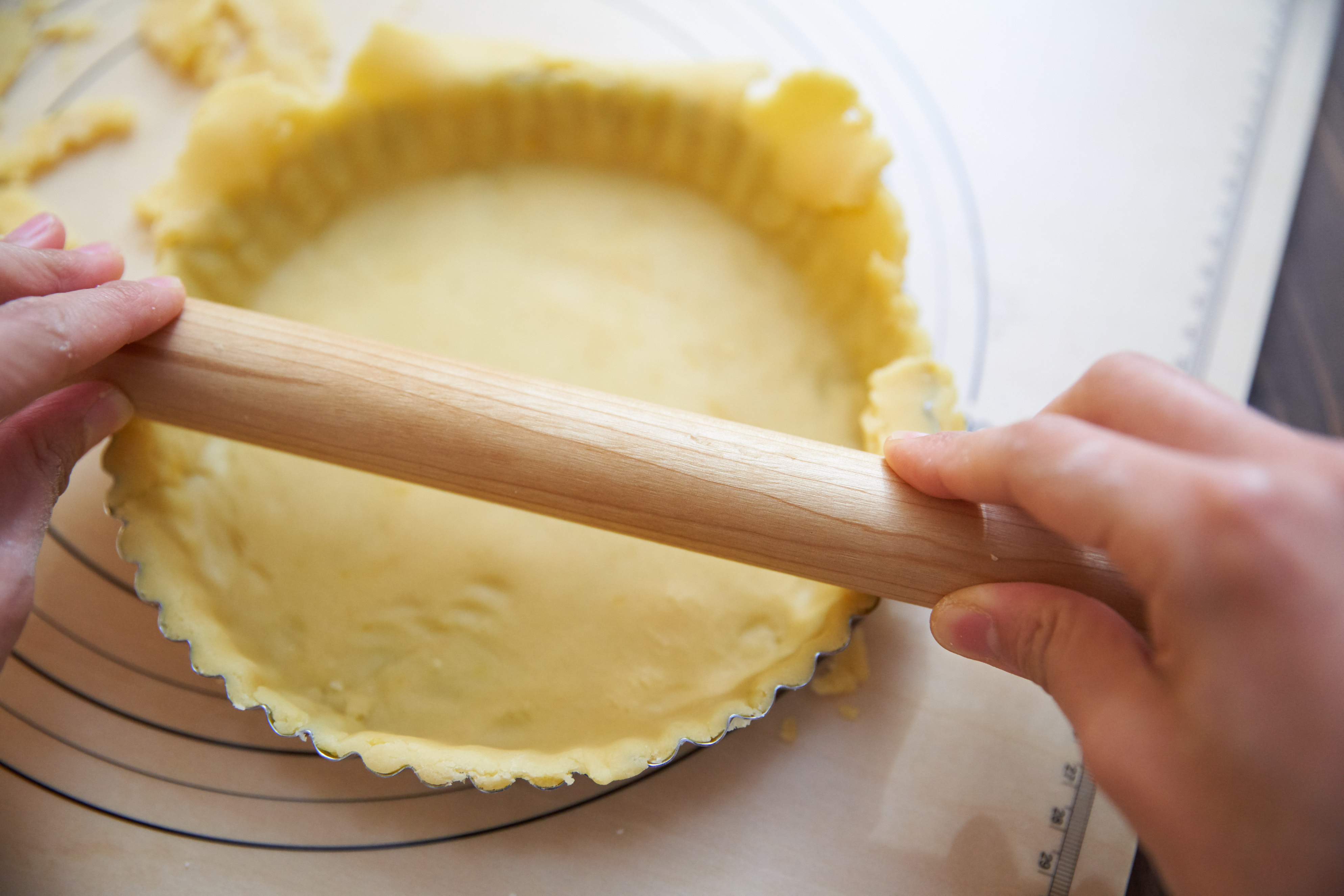 型の上で麺棒を転がして余分な生地を切り落とす。