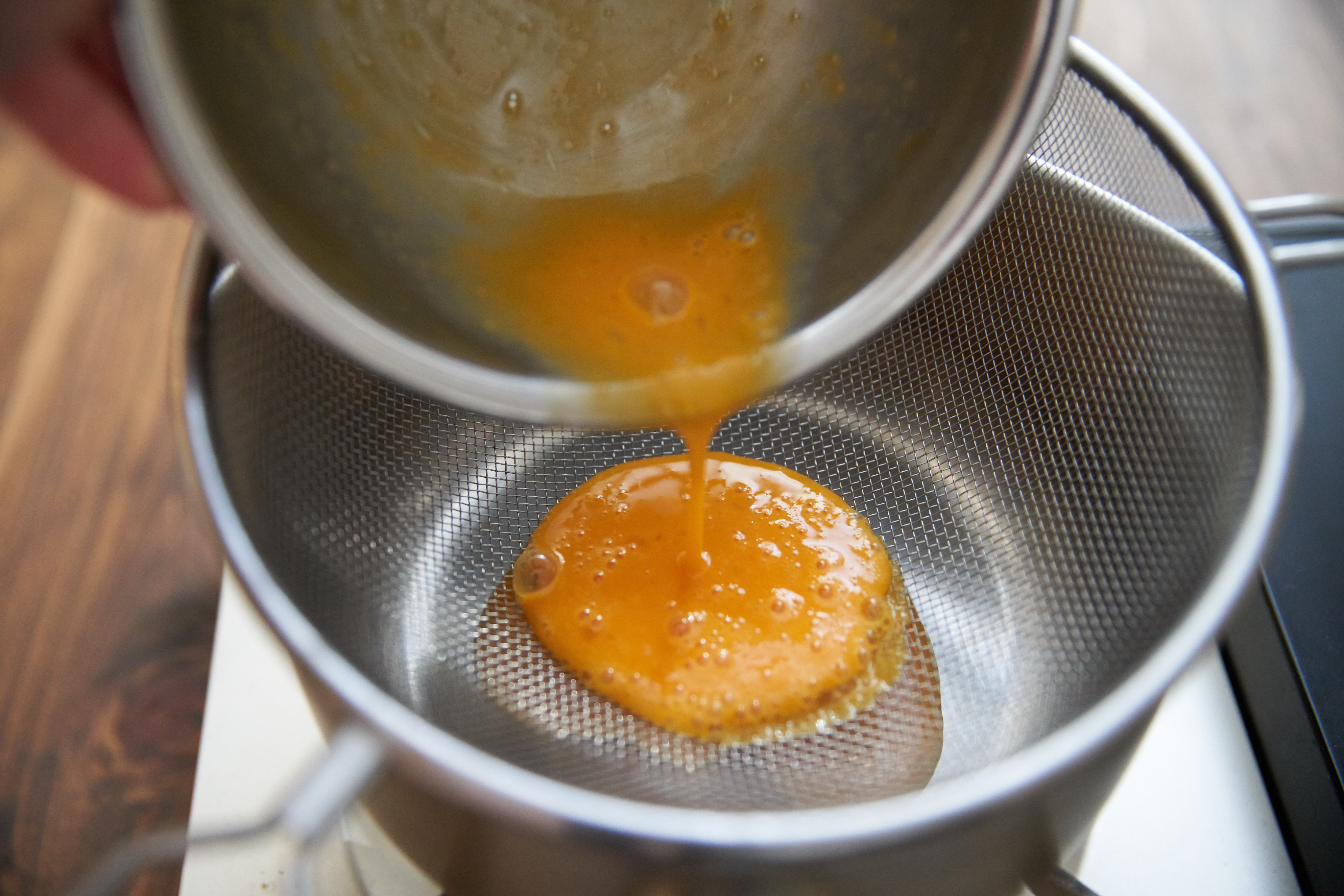 ボウルに卵入れて泡立て器でよく混ぜ、ざるで漉して鍋に入れる。