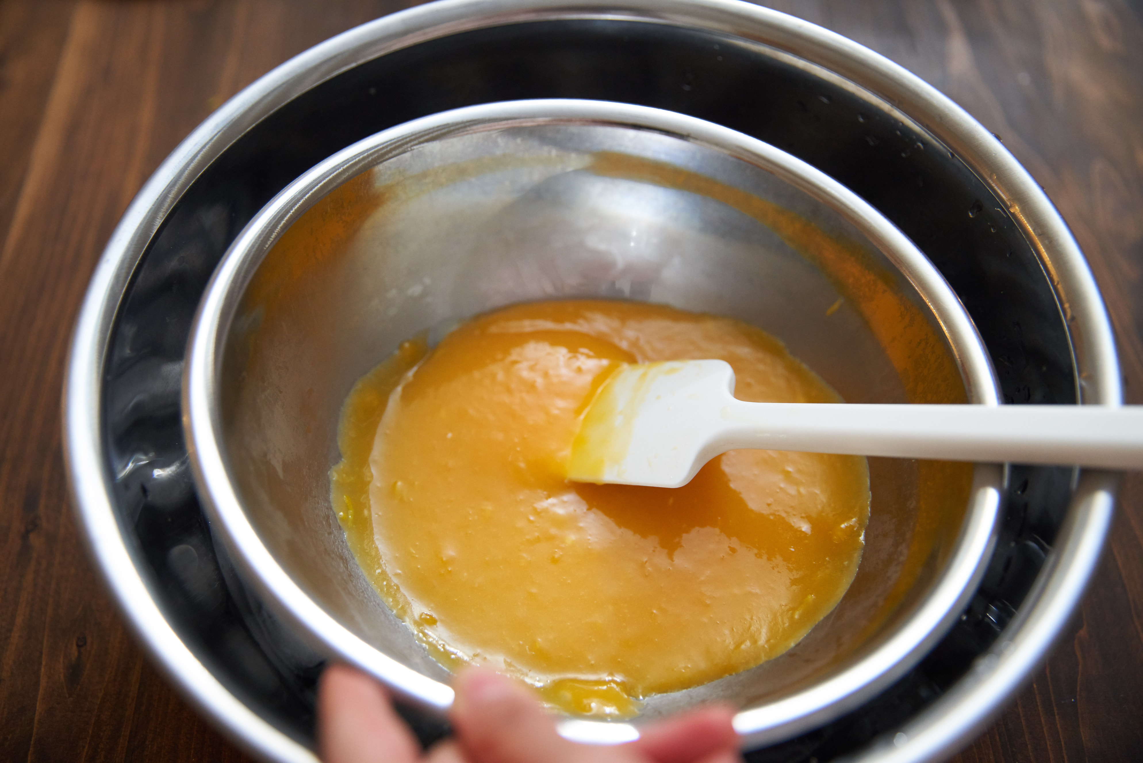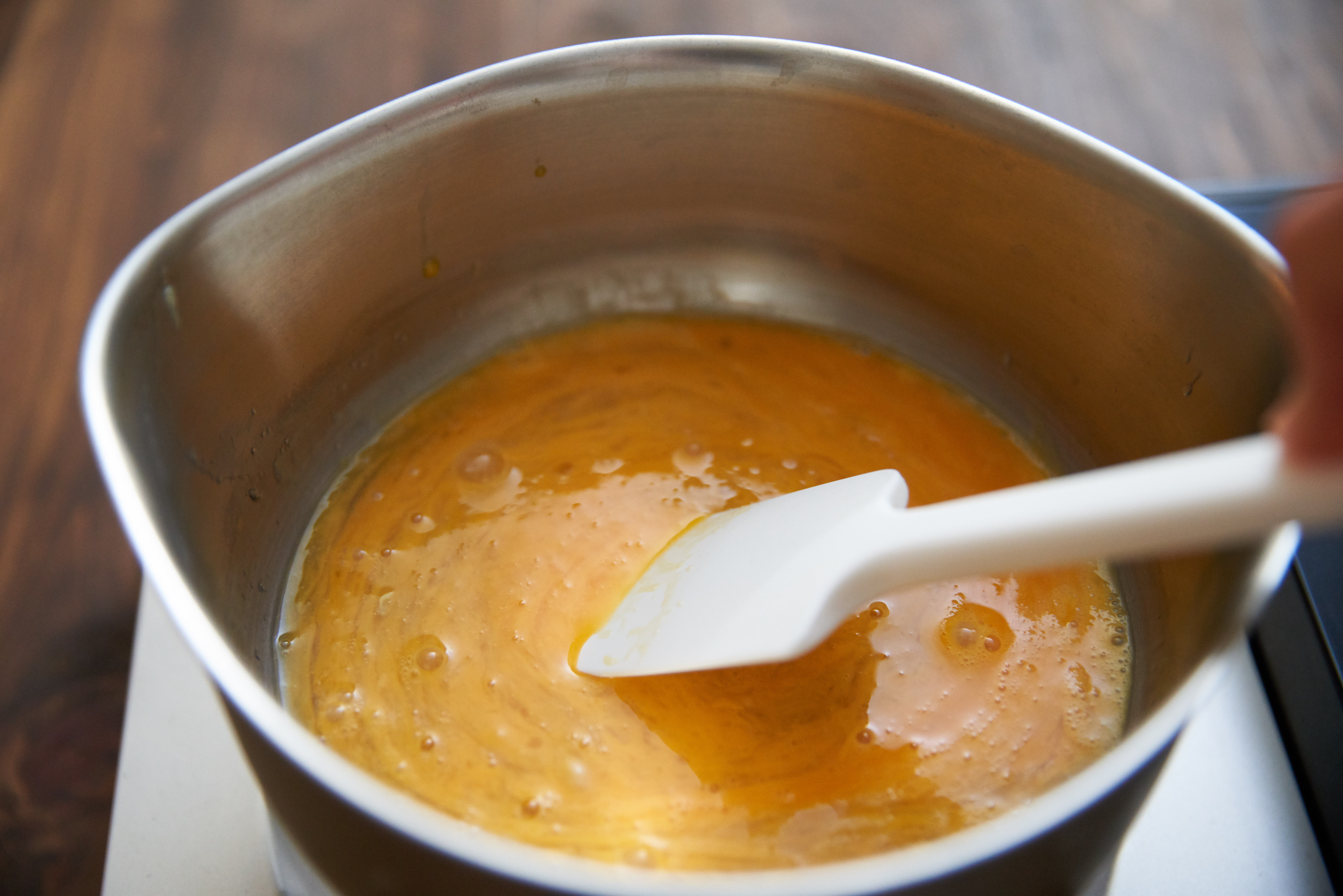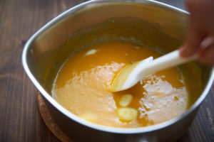 グラニュー糖、レモン果汁を加えて中火にかけ、へらでかきまぜながら加熱する。
