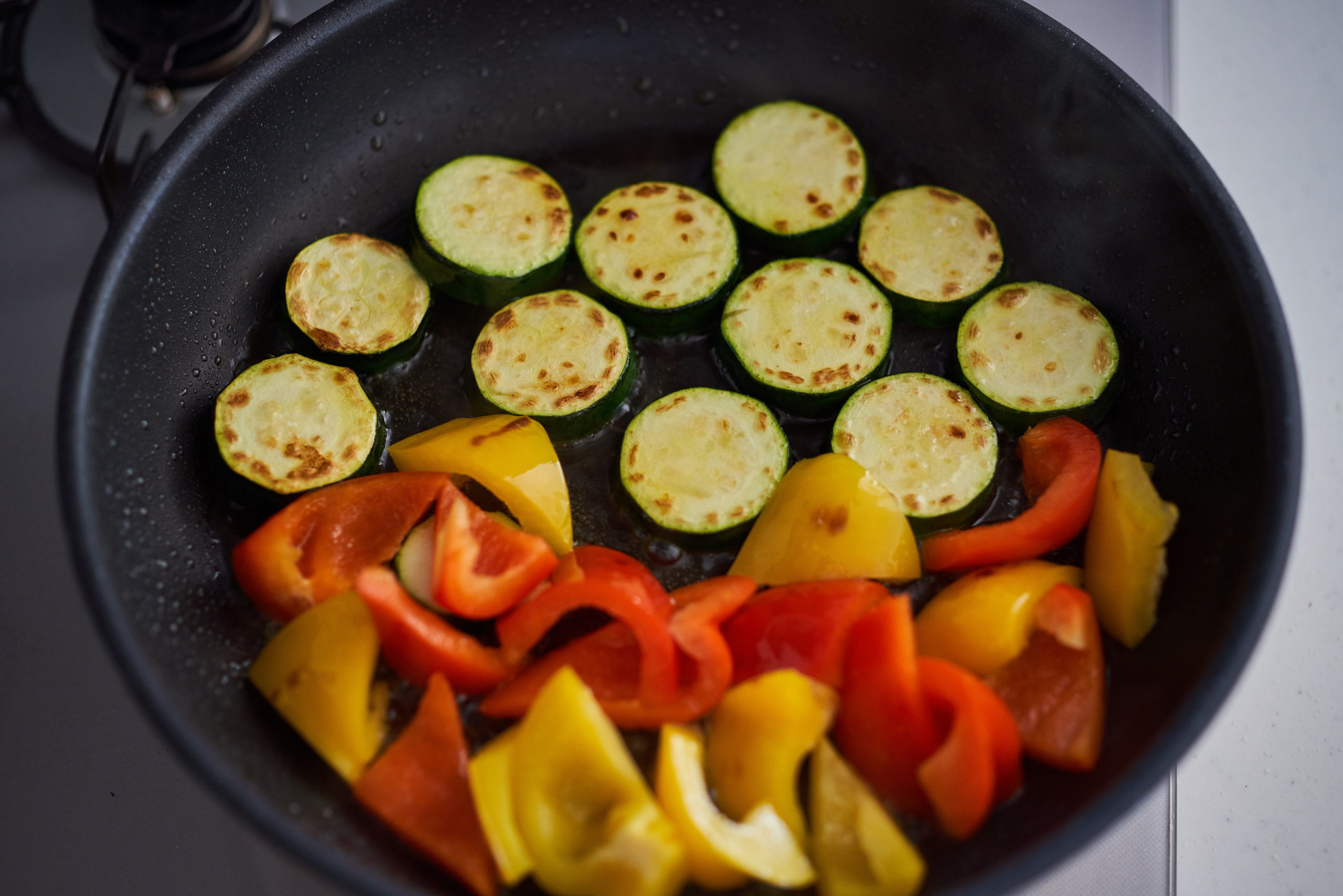 ズッキーニ、パプリカを入れて両面焼く。