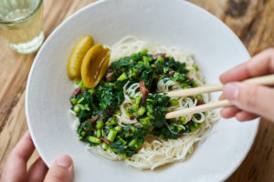 梅干しをちぎり入れて、蓋をして5分蒸し焼きにする。