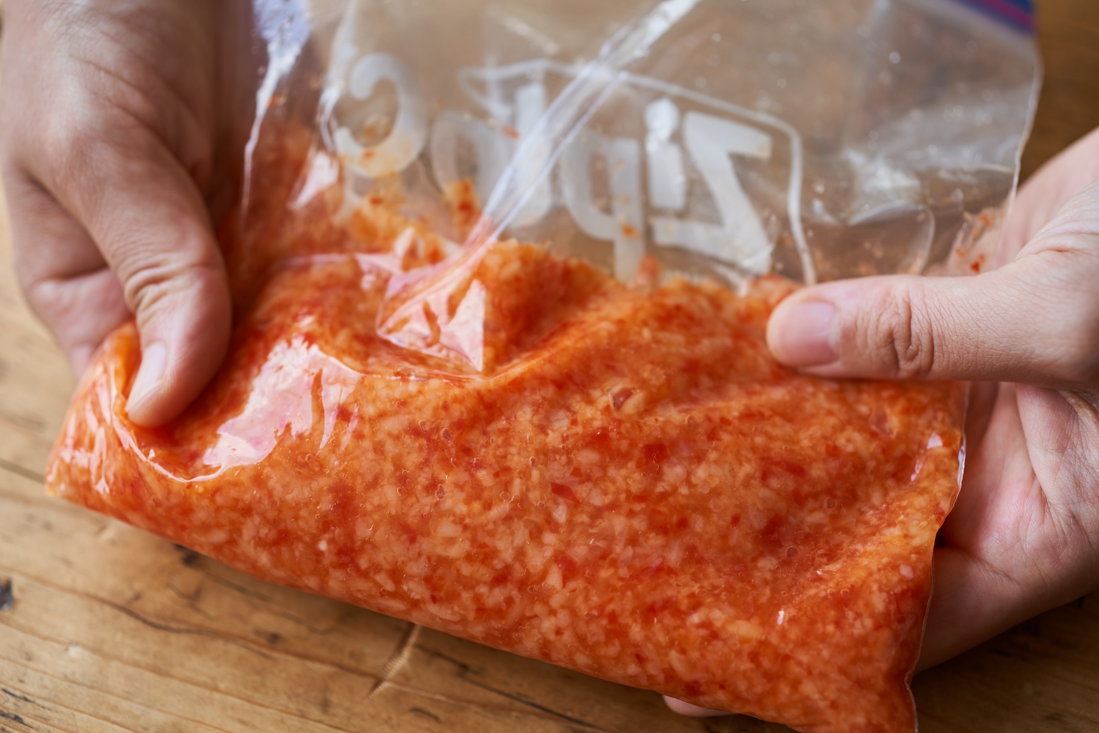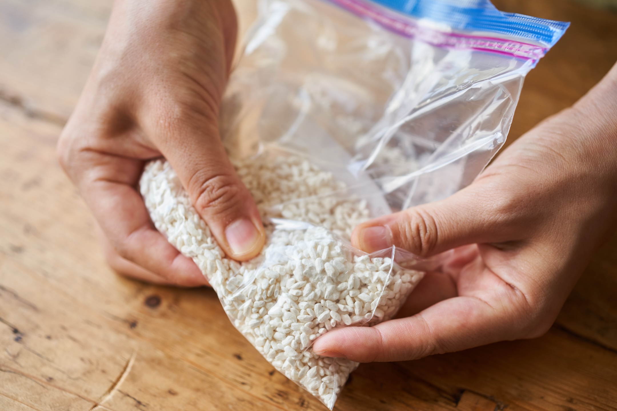 ジッパー付き保存袋に、米麹を入れ、塊があればほぐす。