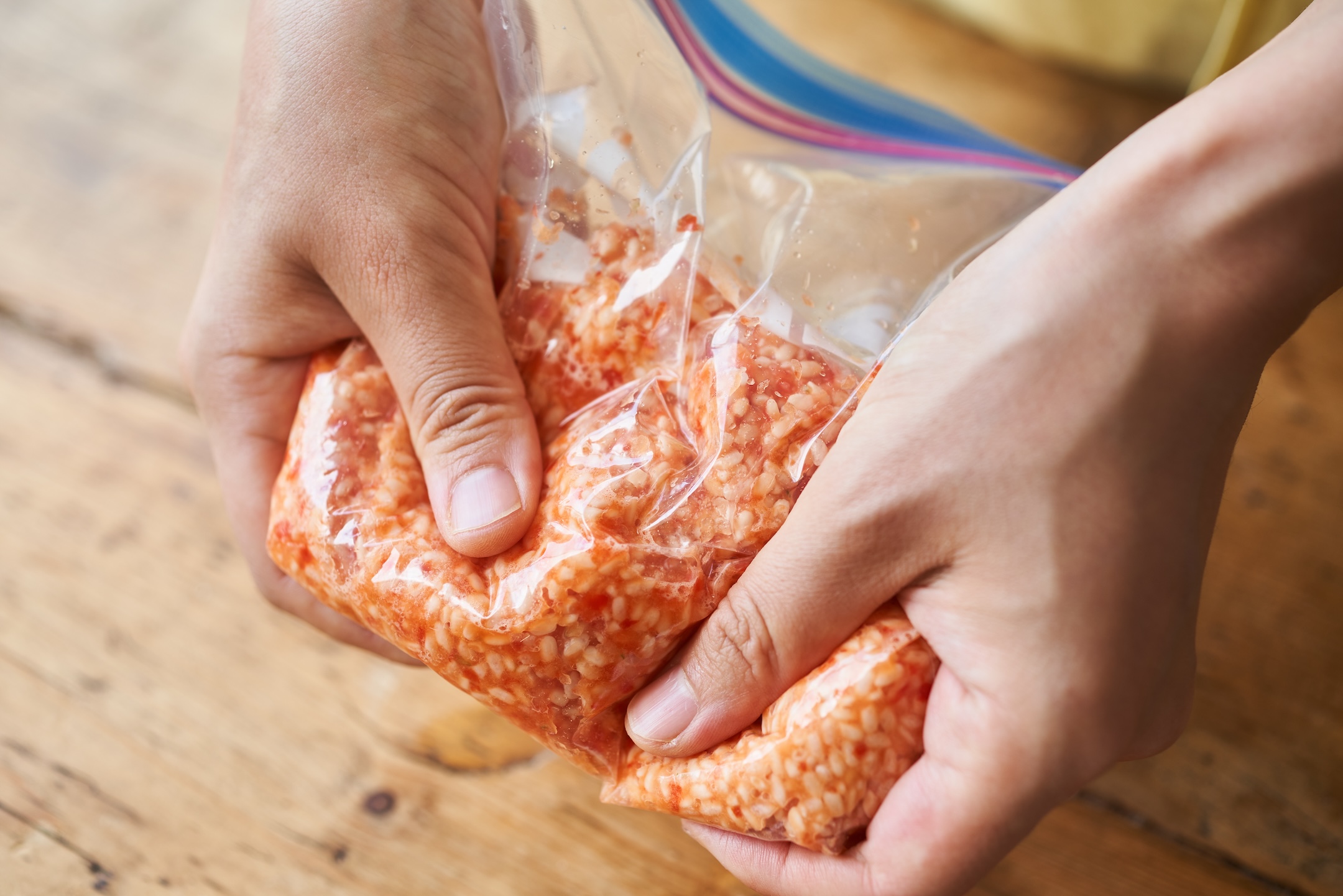 1、塩を加え、袋の上からなじませるように揉む。