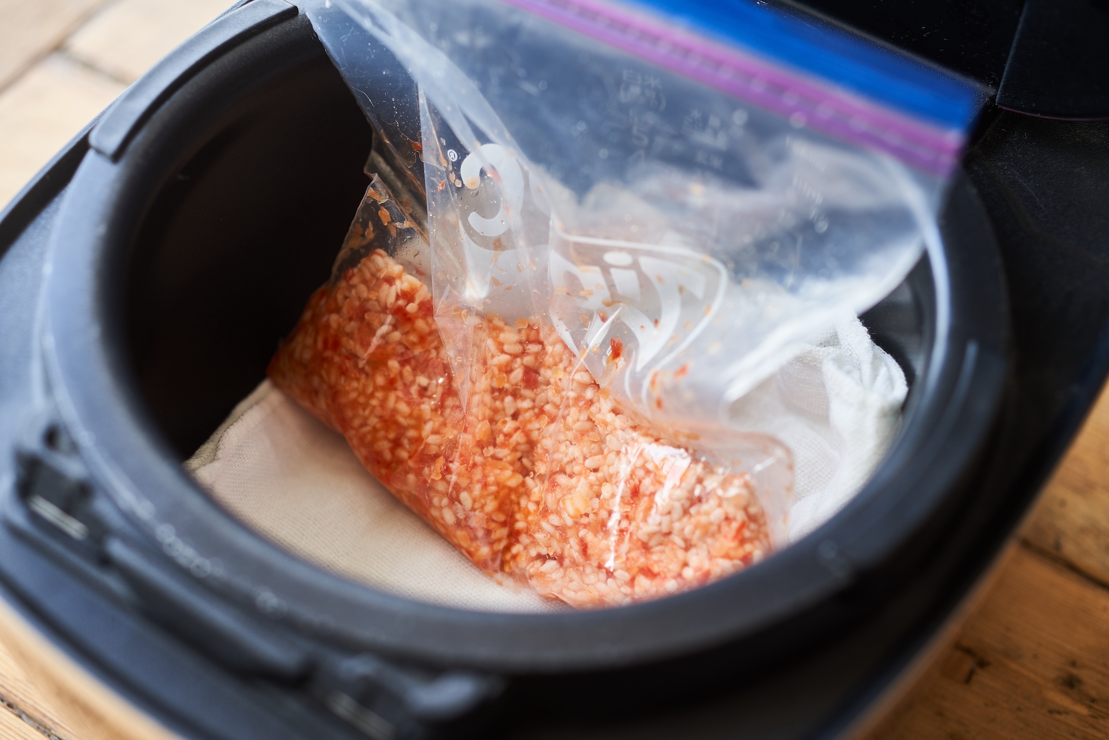 炊飯器の内釜にふきんをしいて、1の袋をジッパーを少し開けておく。