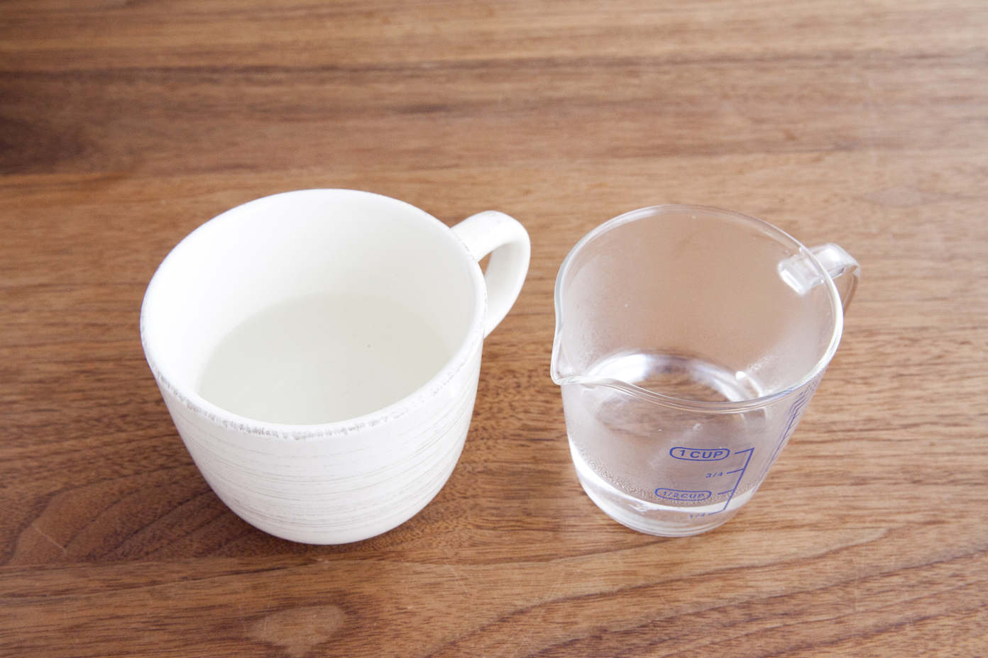 【1】カップ(飲む用)に熱湯を入れて温めておく。計量カップに70ccの熱湯を入れる。