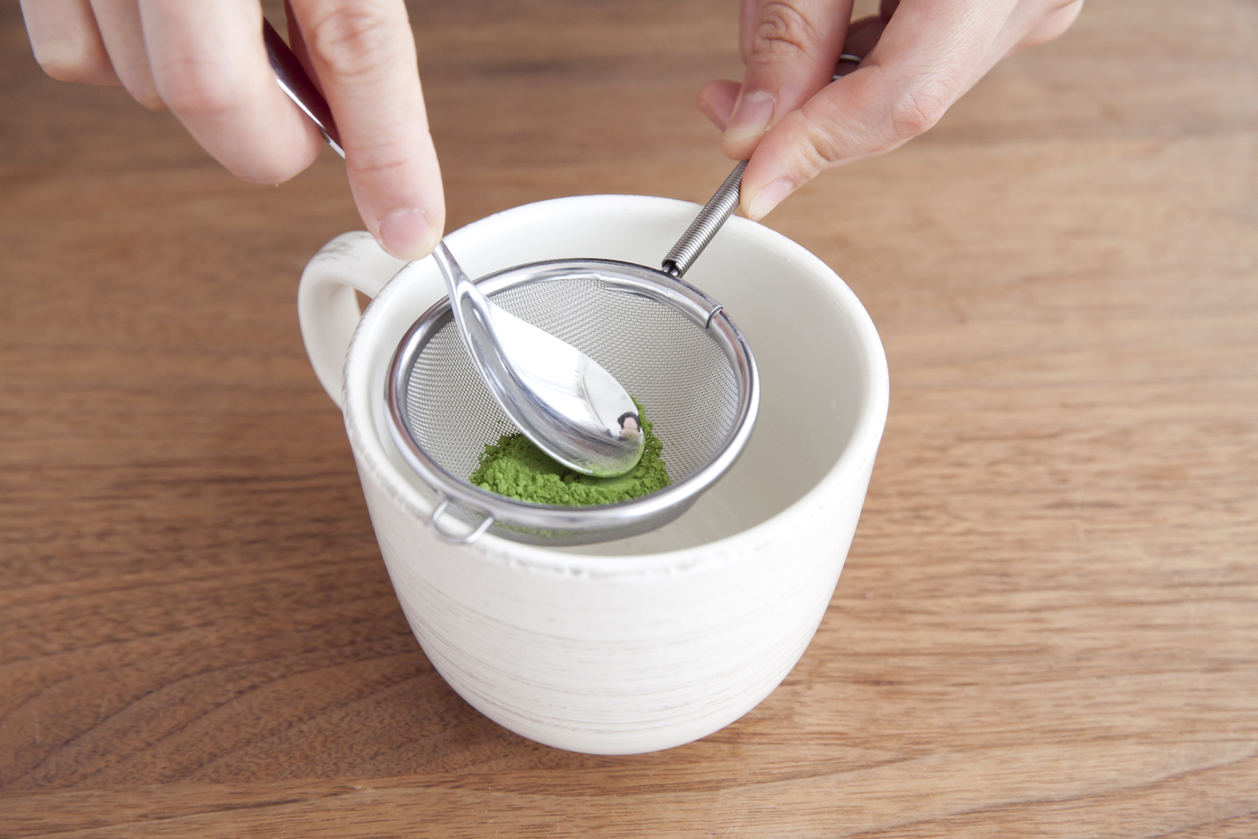 【2】カップの湯を捨て、ティースプーン一杯程度の抹茶を茶こしでこしながらカップに入れる。