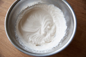 グラニュー糖を3回に分けて入れ、しっかりとツノが立つまで硬いメレンゲに泡立てる。
